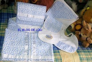 Bueno también he ido cosiendo y aquí os enseño un conjunto que le he hecho a Jairo el nieto de mi amiga, el cambiador, la toalla de baño, toalla de lactancia y dos baberos.